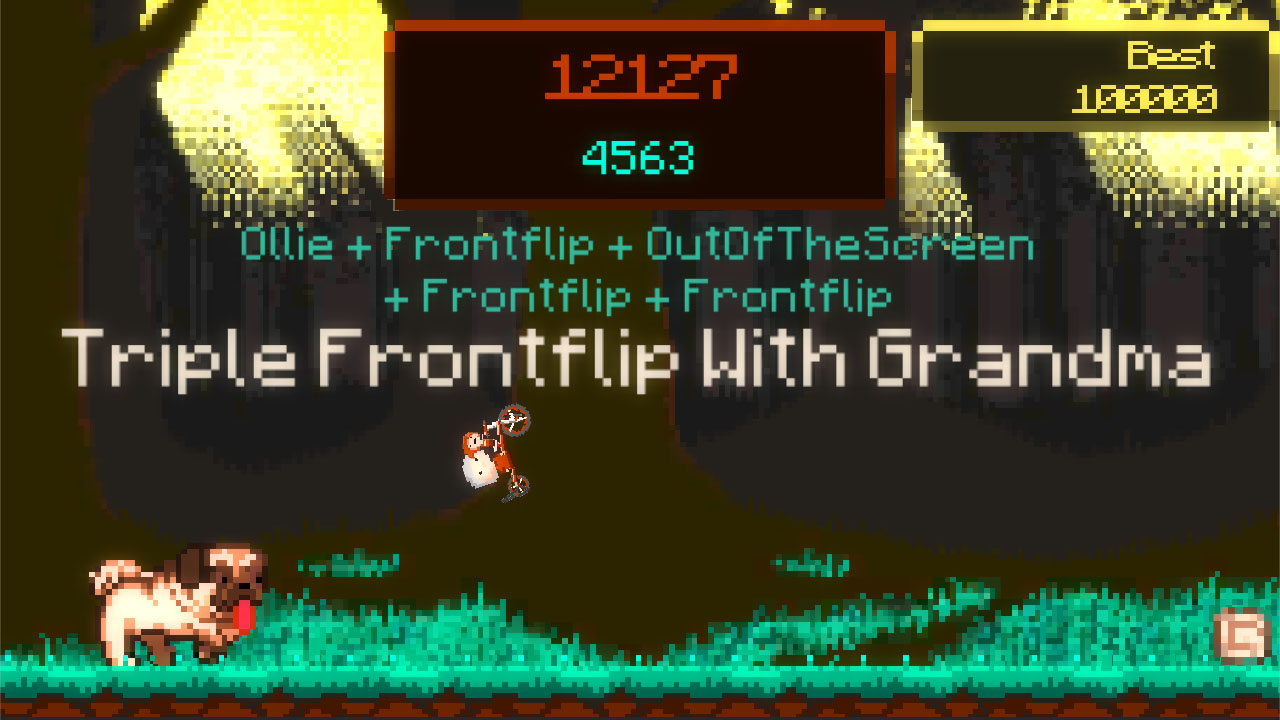 Quando eu era professor no curso Técnico em Jogos Digitais do Senac Nações Unidas organizei uma game jam com os alunos durante a qual eles teriam 2 semanas para fazer um jogo que usasse somente 3 cores base e que funcionasse tanto na Web quando em celulares. O tema escolhido foi "Vovó". Entre as orientações, resolvi entrar no mesmo desafio e desenvolver um jogo. Minhas inspirações foram Canabalt, o conto de Chapeuzinho Vermelho e as manobras de Tony Hawk Pro Skater. As regras permitiam o uso de assets prontos para que o foco ficasse no desenvolvimento das mecânicas e design do jogo. Nese projeto desenvolvi toda a programação, incluindo o sistema de identificação de manobras, quadro de potuações, achievements e a integração, na versão para android, com o Google Play Games, permitindo que jogadores competissem pela maior pontuação e registrassem eus achievements. Precisei desenvolver o sprite da bicicleta e da chapeuzinho vermelho mas não me preocupei muito com consistência de pixels ou na arte como um todo pois meu foco era desenvolver a mecânica de manobras. Todo o jogo foi desenvolvido em duas semanas, sendo a primeira para finalizar o jogo e a segunda para integrar o sistema do Google Play Games. O jogo ficou em exposição no Senac Santo Amaro em uma tela interativa no laboratório geral apelidado de "Nasa" pelos alunos. A tela consistia em um computador projetando a imagem em uma tela de vidro transparente de aproximadamente 40 polegadas com sensores de toque que permitiam aos jogadsores jogar clicando no vidro.